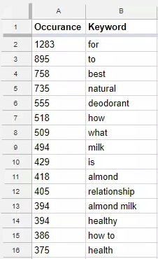 比如,关键词:“最佳天然蛋白粉”由四个术语组合而成:“最佳”、“天然”、“蛋白质”还有“粉末”。我们分析关键字的组件部分,能够轻易地分析并理解哪些术语重复次数最多。