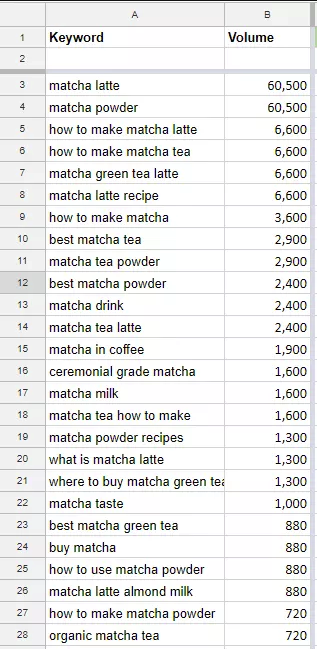下图为第一个组的实例:“matcha”组,一个站点都是关于抹茶的关键词。