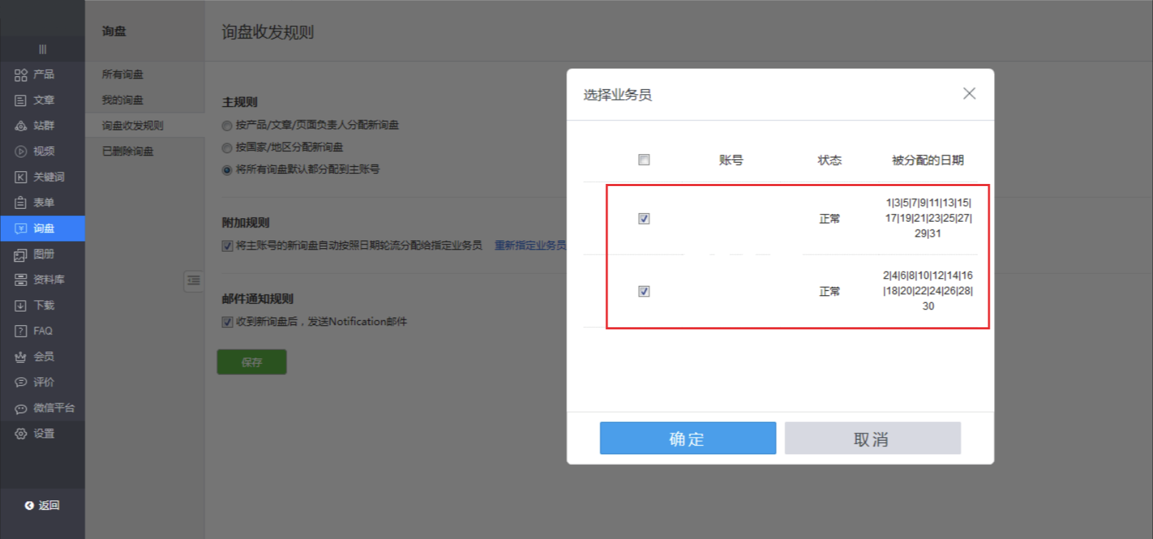 【应用场景】根据客户反馈,在日常工作中需要分配询盘跟进任务,因此我们新增了询盘分发规则,可将主账号收到的新询盘按日期分配给指定业务员,从而保证询盘跟进工作公平、高效开展。