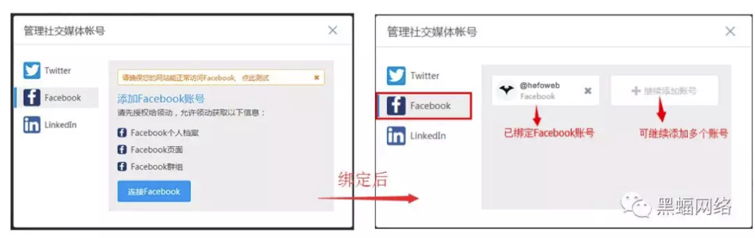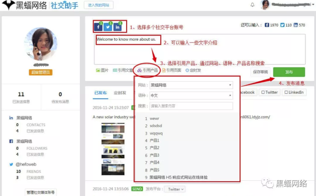黑蝠云营销平台已打通与Linkedin、Facebook、Twitter、Pinterest等平台的连接,网站上的内容可以通过图文并茂的方式,一键分发到各大社交平台,为网站增加曝光量。