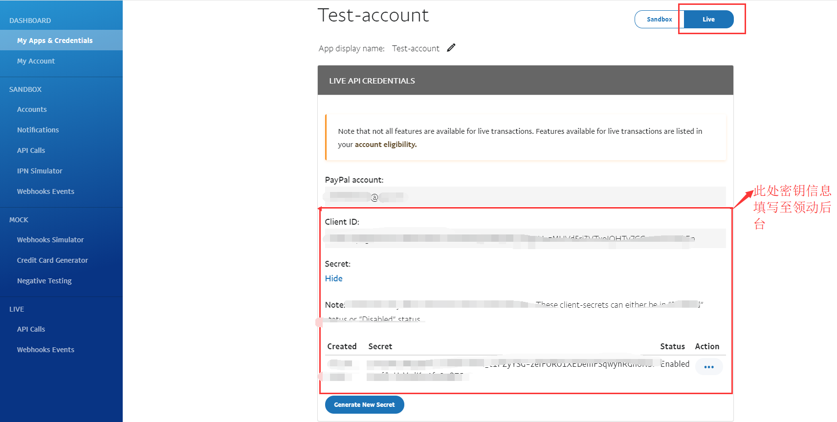 1.4.创建项目后点击Live按钮,获取账户密钥信息。