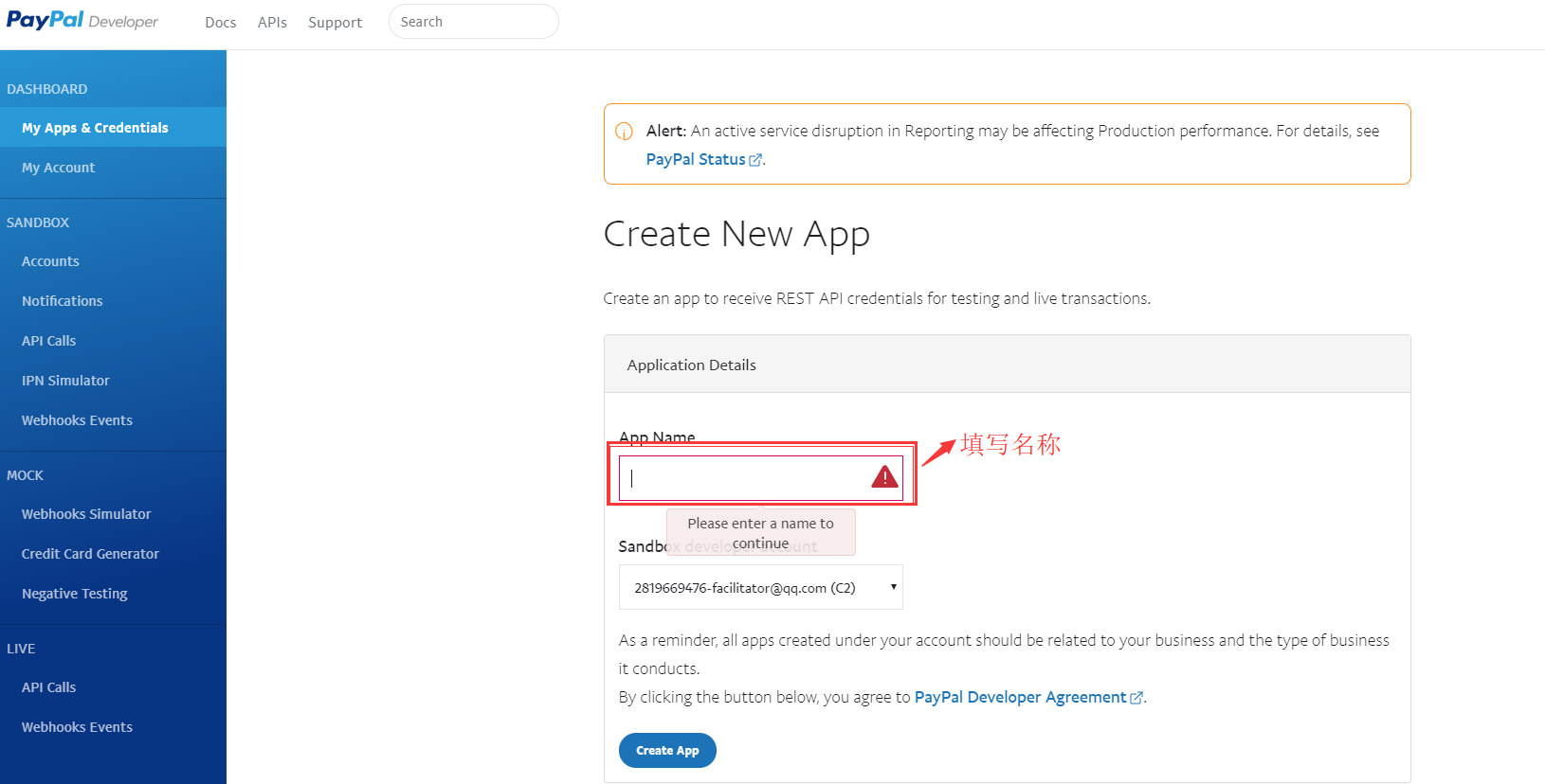 注意:点击Create APP按钮显示灰色,说明PayPal账户未激活,请到验证邮箱进行激活,如图