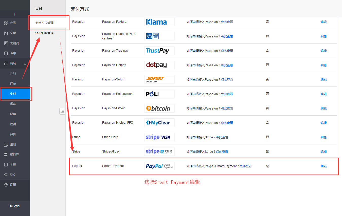 2.1.登录黒蝠后台,进入“内容管理”后台,点击“支付”菜单,在“支付方式管理”页签中,新增了“Smart Payment Button”的支付方式,然后点击“编辑”按钮,如下图所示: