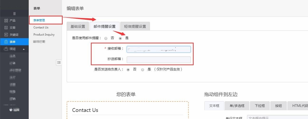 第二步:登录黒蝠后台,检查表单管理中,是否开启了邮件提醒功能,设置的收件人是否正确,如下截图所示。建议使用自己的企业邮箱来接收询盘邮件。不建议使用QQ邮箱,因为QQ邮箱被拒信的可能性比较大。