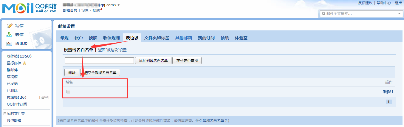 第一步:请把黒蝠的邮件域名(hefoweb.cn)添加到邮箱的白名单中。这里以QQ邮箱为例,在邮箱设置->反垃圾->设置域名白名单页面,添加hefoweb.cn到白名单即可,如下截图所示。如果自己的邮箱不会操作的话,请咨询邮箱提供商。