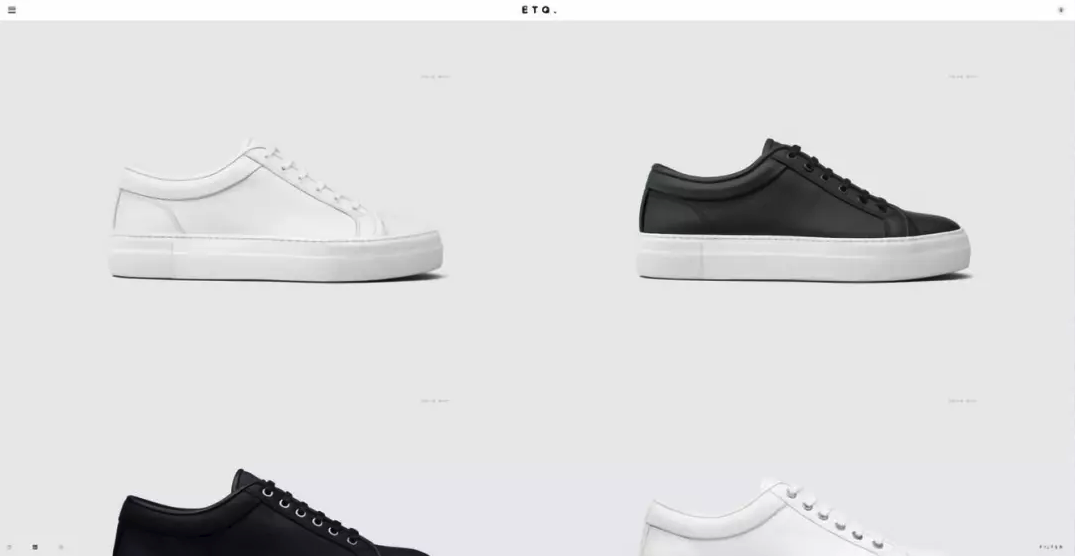 使用十分简约的表现方式,与花哨的形式不同,没有眼花缭乱的视觉效果。利用简单的、平面的、浅灰色的背景加上排版,方便访客把所有的注意力全部放在产品上,可以快速找到自己先换的鞋子。