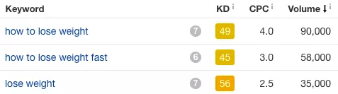 例如下面这一组数据:“如何更快的减肥”比“减肥”搜索量大,数据对比非常明显: