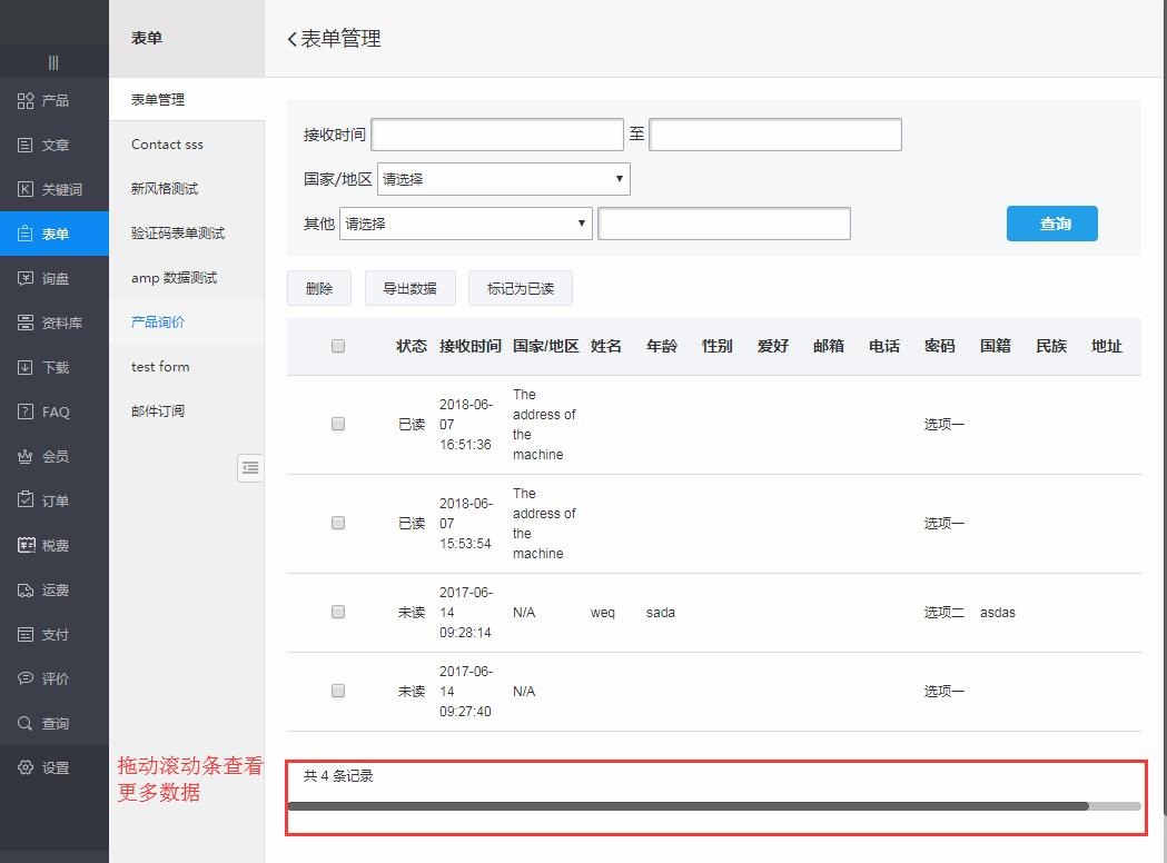 【应用效果】当表单项过多时,表单下方将会出现滚动条,你可以通过左右滑动滚动条来查看更多数据,效果如下图所示: