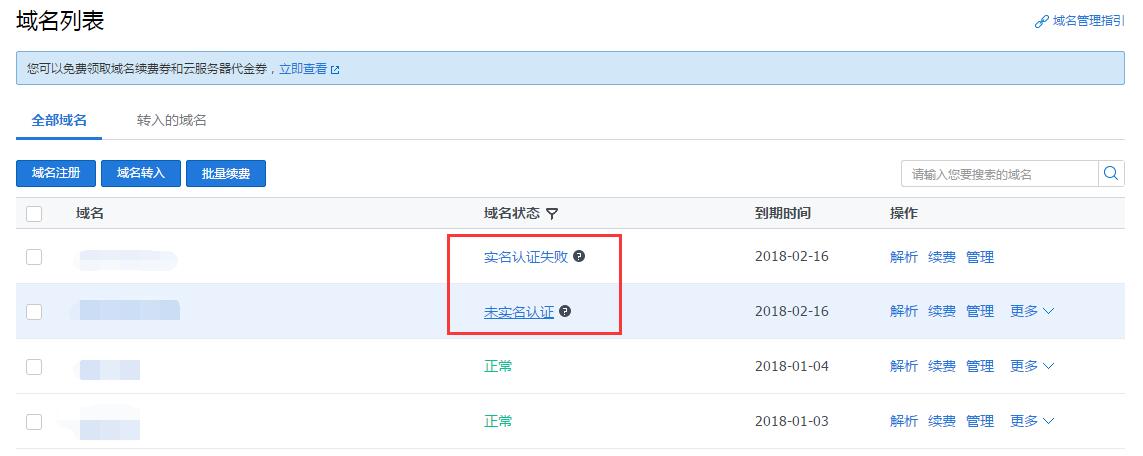 域名注册成功后,进入域名管理控制台,在全部域名列表或未实名认证域名中看到自己的域名状态。