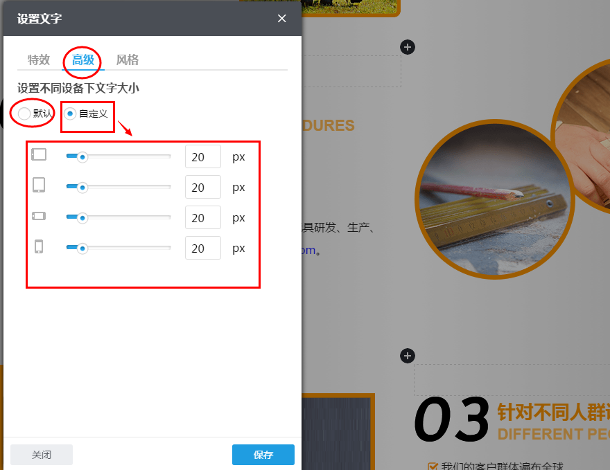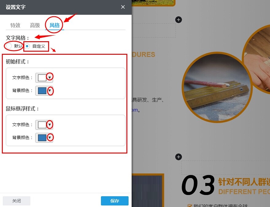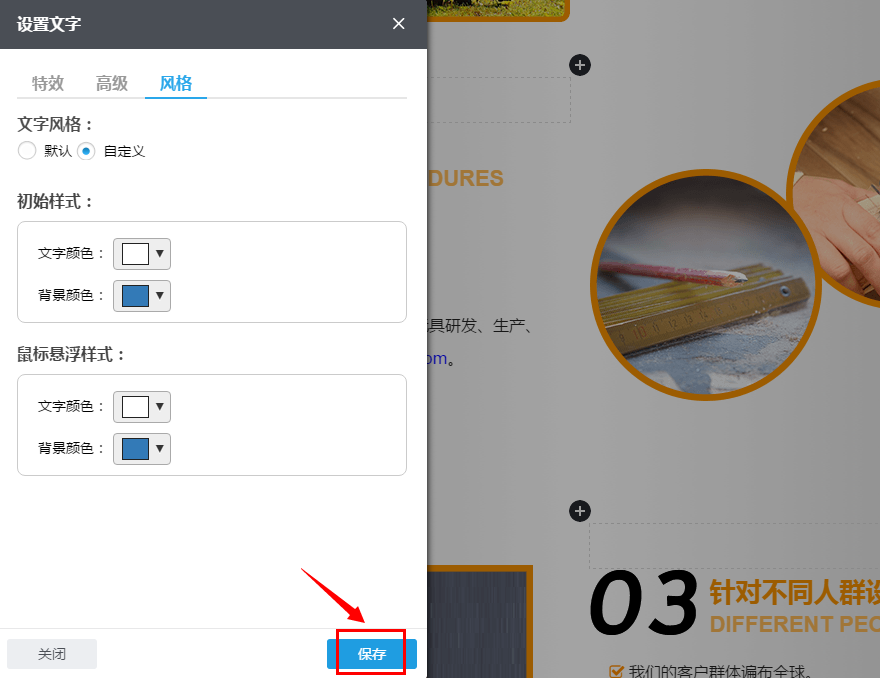 3.6 设置好文本组件的特效。高级功能和风格后,单击设置框右下方“保存”按钮,以保存所设置的。