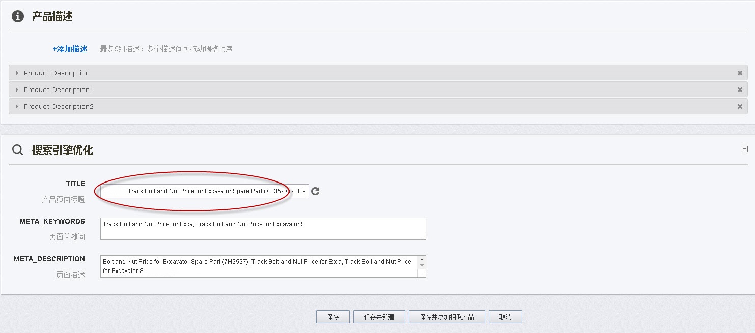 3、在这个编辑页面的最底端,有一块内容是关于搜索引擎优化的,有一个是Title产品页面标题,您可以直接在这里修改为自己要推广的标题,修改好保存即可。下面还有页面META_KEYWORDS页面关键词、页面META_DESCRIPTION页面描述,在这里可以修改页面的关键词、描述。