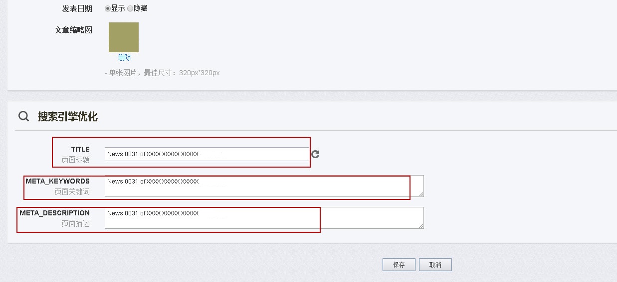 3、在这篇文章编辑页面下端,我们可以看到搜索引擎优化,在这里可以修改这篇文章的TITLE页面标题、KEYWORDS页面关键词、DESCRIPTIONG页面描述。