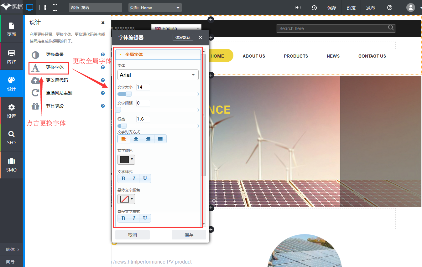 【操作方式】页面编辑系统-》设计-》更换字体-》全局字体。