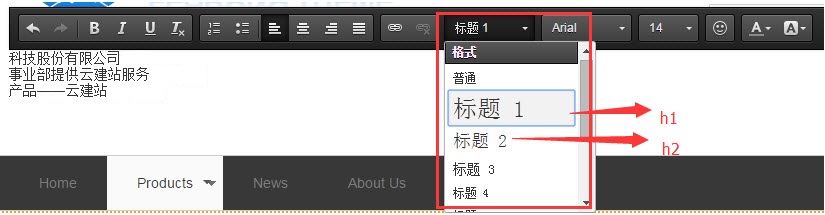 A:在我们的文本组件、图文展示组件的富文本编辑器中,就可以直接把文字添加 为<h1><h2><h3><h4><h5><h6>标签,具体 在工具条中如下截图所示位置: