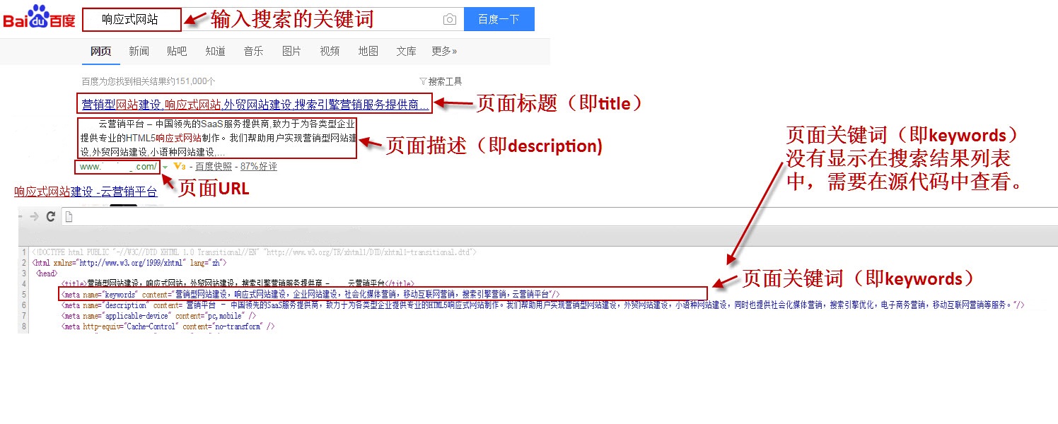 页面的Title、Keywords、Description参数,简称页面TKD参数,Title、Keywords、Description分别是指一个页面的页面标题、页面关键词、页面描述,如下以百度搜索引擎为例展示Title、Keywords、Description在页面上的呈现形式: