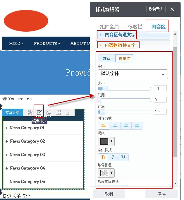 组件自定义样式:在组件的编辑样式中可以修改内容区普通文字或内容区带链接文字的相关信息;其它组件只要有样式编辑器修改位置都是在这里;